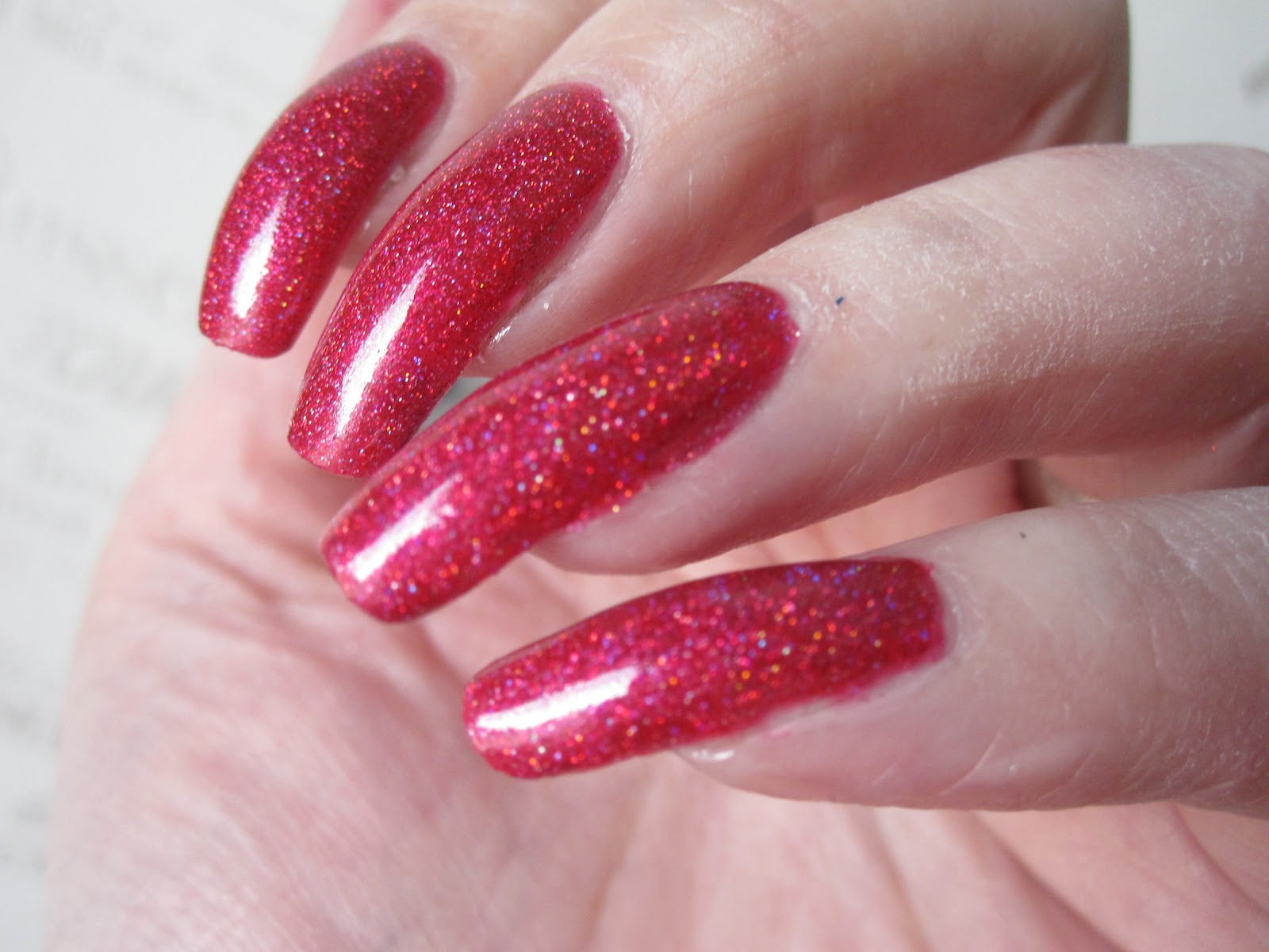 Jag beställde ett gäng NUBAR-lack på nätet (http://www.beautybay.com/). Rapport om dessa kommer i ett senare inlägg, jag älskar dem alla. Först ut att få följa med mig och mina naglar ut är ett rosarött hologramlack som heter Prize. Jag gillar det skarpt och det passar extra bra när det är sol ute, för då glittrar det om möjligt ännu mer!