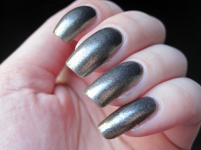 Först ut att testas av Spiderman-lacken fick bli Number One Nemesis. Ett varmgrått lack med glass flecks i tja... guldgrönt. Ett svårt lack att definiera, det ser mycket gråare ut i flaskan än på nageln, och det är guldigare än bilderna. Ett klassiskt snyggt lack, att känna sig dressad i! 3 lager har jag på bilderna, men lite vnl blev det ändå, men det stör inte.